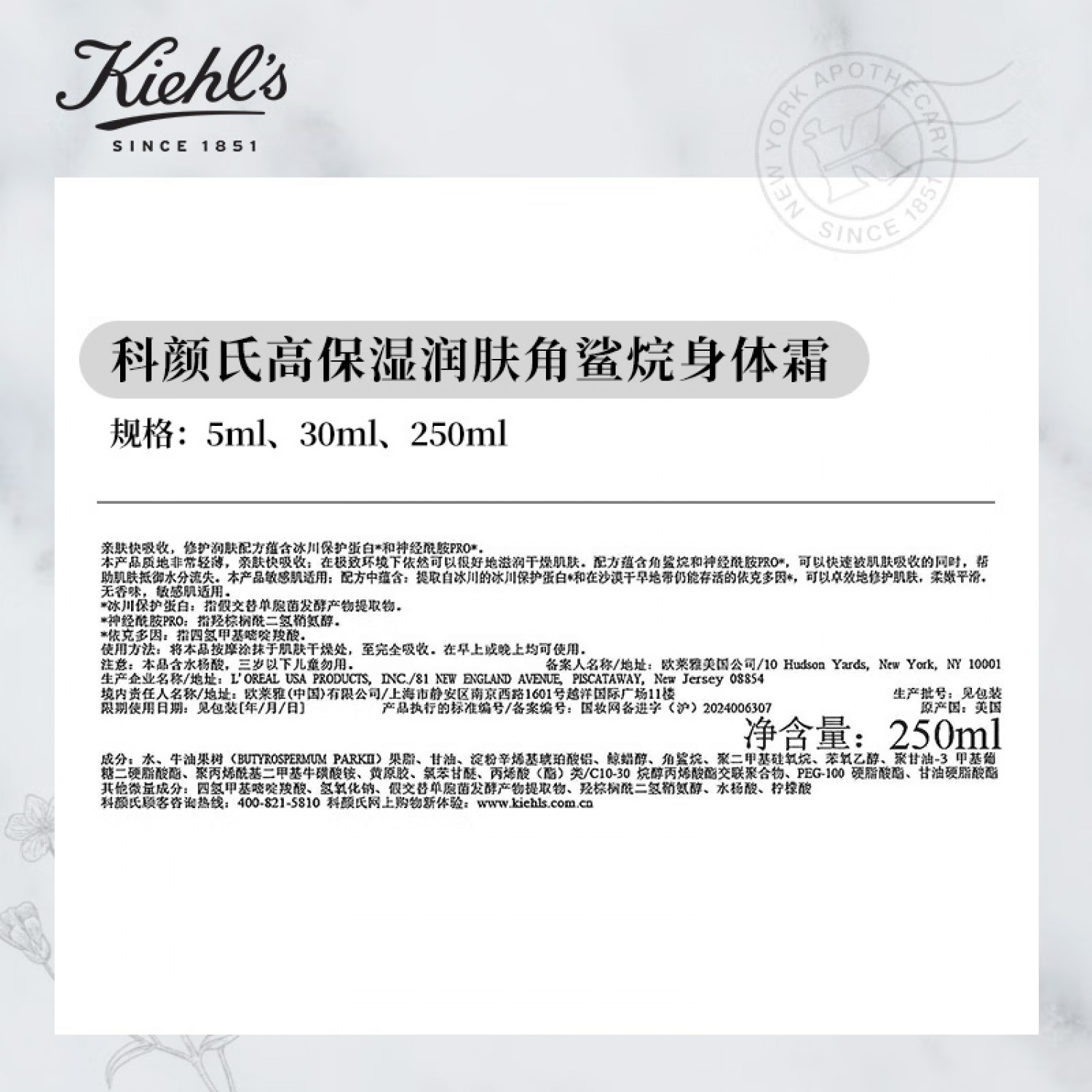 Kiehl's科颜氏高保湿身体霜250ml身体乳保湿滋润秋冬干燥舒缓修护
