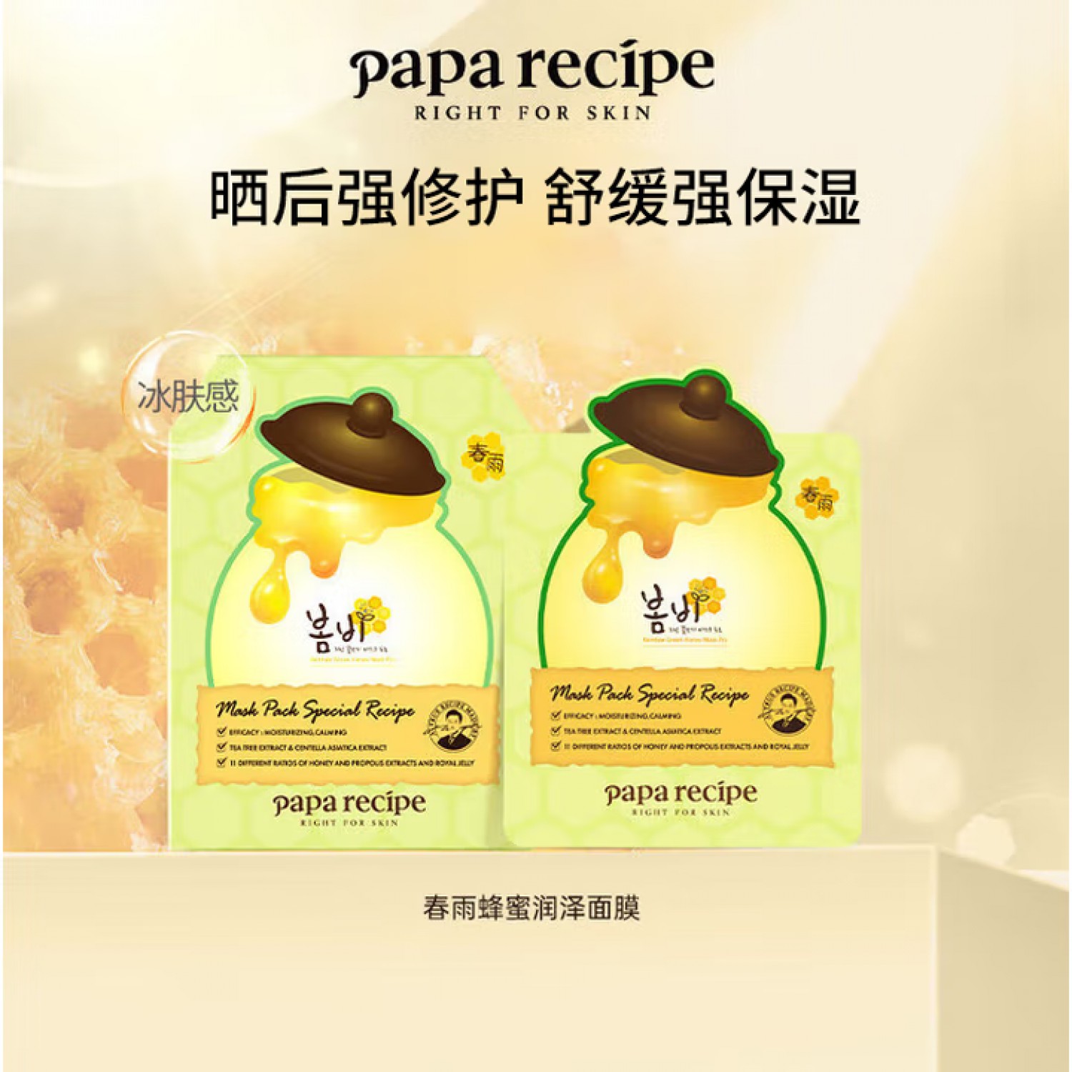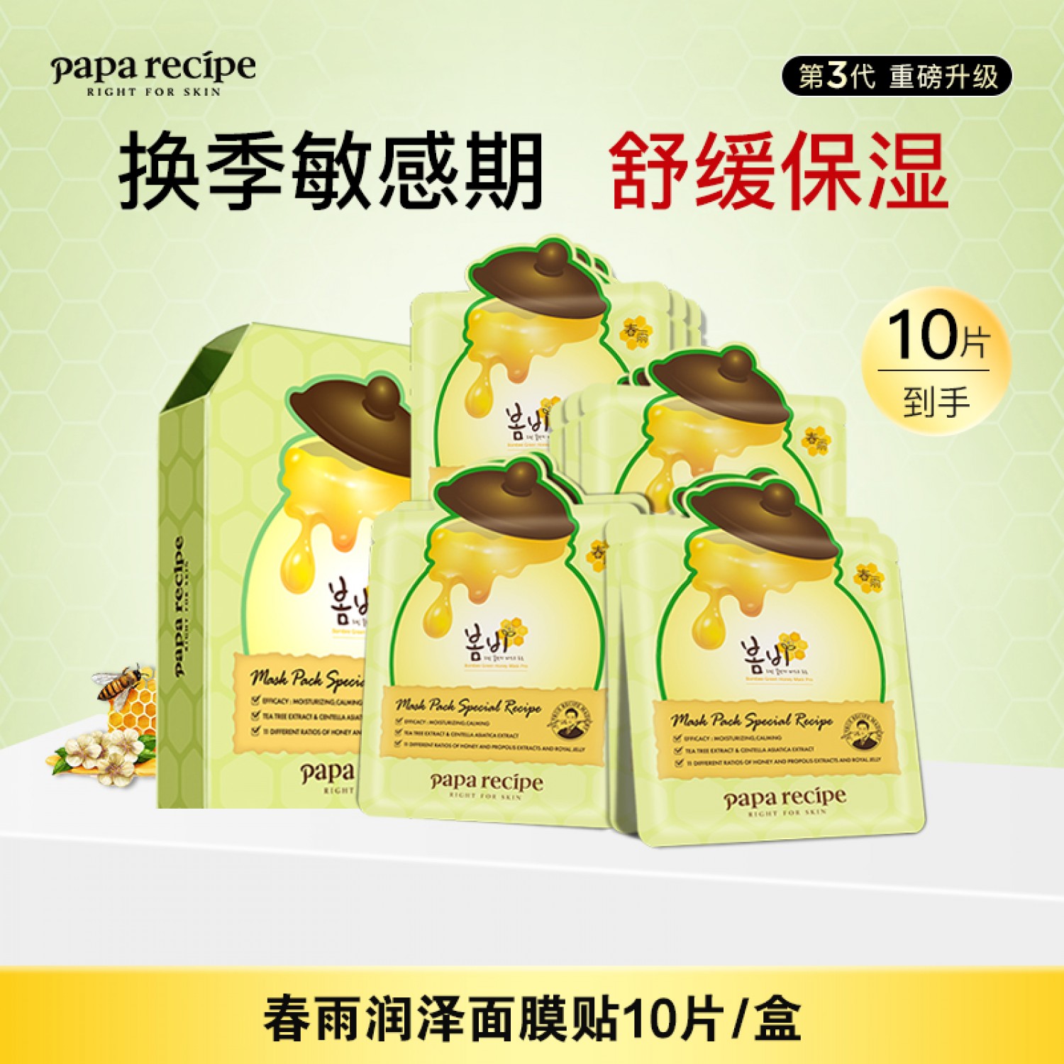 韩国paparecipe绿春雨蜂蜜润泽面膜积雪草舒缓泛红晒后急救10片装
