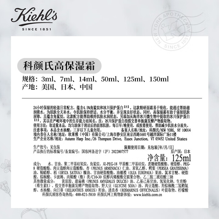 商品名称:【会员限时特惠】Kiehl's科颜氏高保湿面霜125ml 高保湿 滋润补水