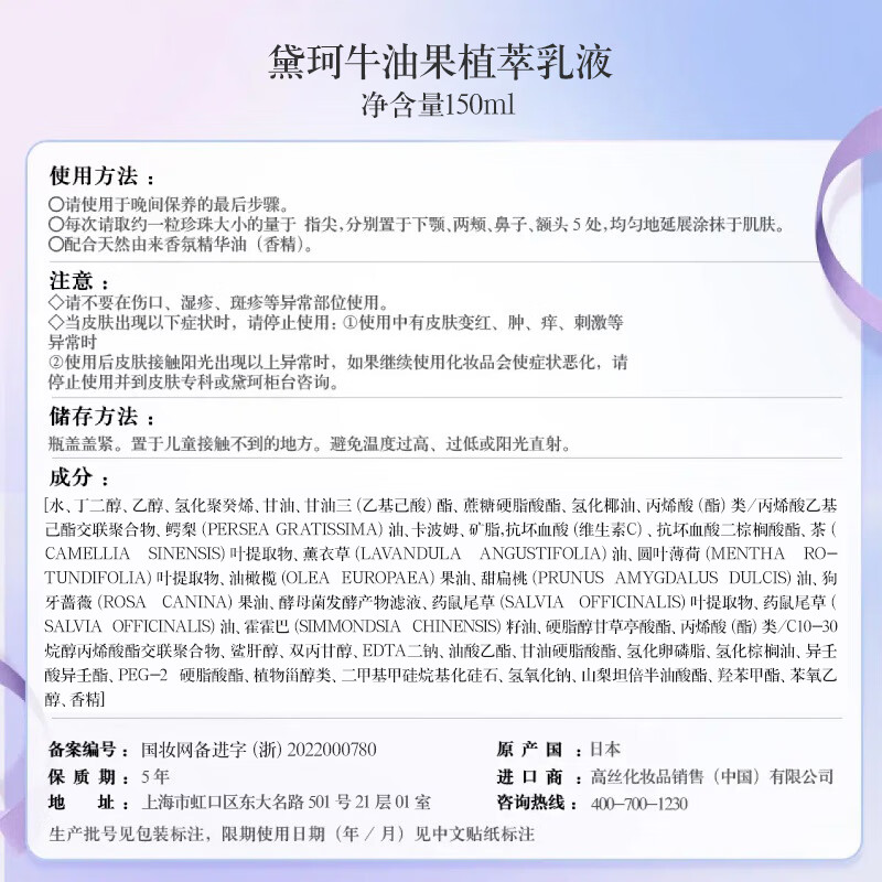 商品名称:黛珂牛油果乳液紫苏精华水护肤套装150ml改善粗糙温和水润保湿