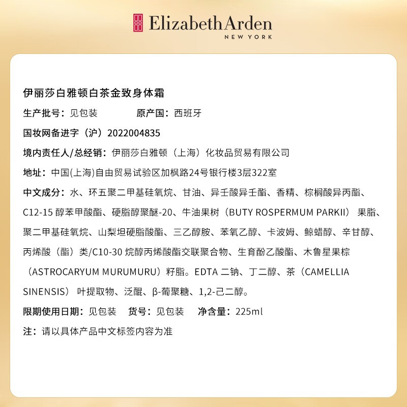 商品名称:Elizabeth Arden雅顿白茶金致身体霜225ml 保湿EDP 香氛身体乳