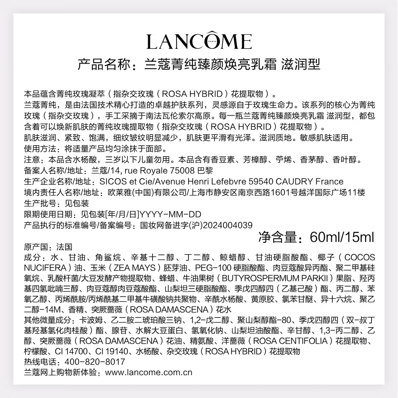 商品名称:【会员特卖】兰蔻菁纯面霜60ml滋润版玻色因抗皱紧致保湿