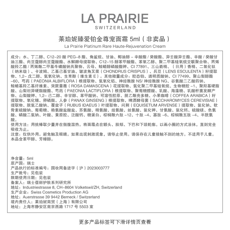 商品名称:La Prairie莱珀妮臻爱铂金尊宠面霜5ml(非卖品)